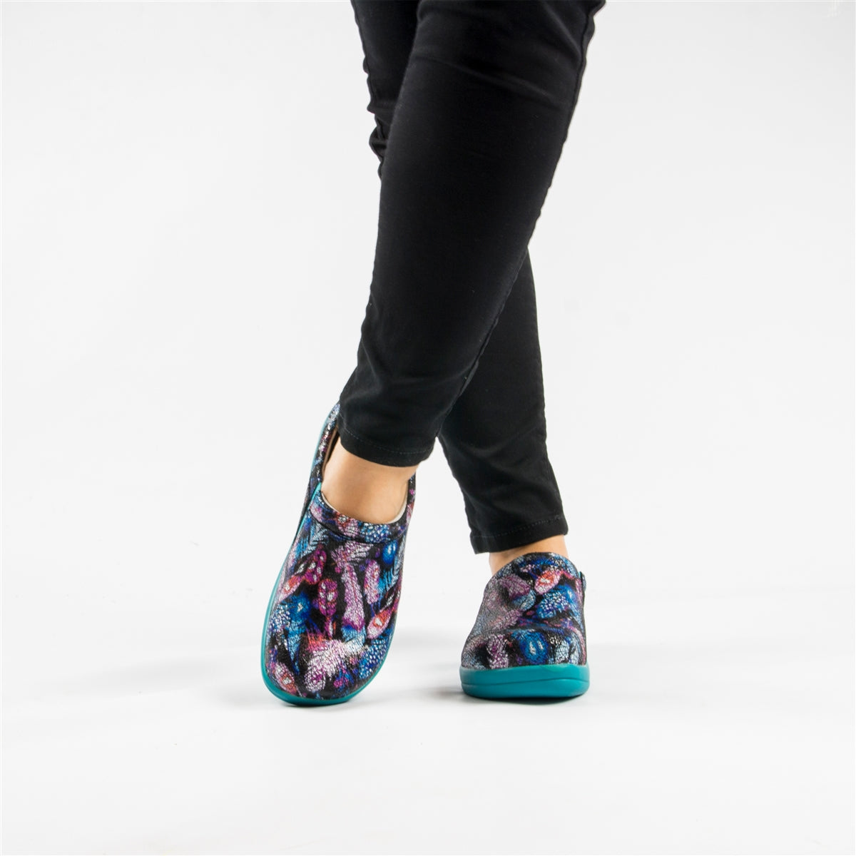Feather pillow comfort is what you'll feel when you complete your winter wardrobe with the Alegria Kayla in Feather Weight! Even though this shoe is called Feather Weight, it's no light weight when it comes to comfort. Starting with the signature Alegria footbed which is ergonomically designed to support your foot and arches and gliding to the dreamy, sky-blue slip-resistant outsole that helps protect you from slips and falls, this classic Alegria clog professional shoe flies above the rest. Feathers in shades of blue, red, pink and purple will catch your dreams of the perfect shift in pleasing comfort. Slip into the Alegria Kayla in Feather Weight today!Additional Benefits: