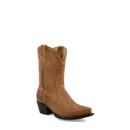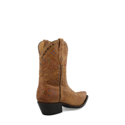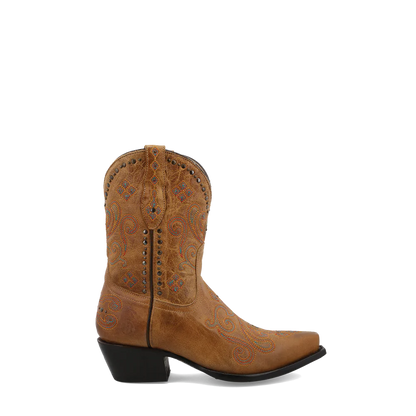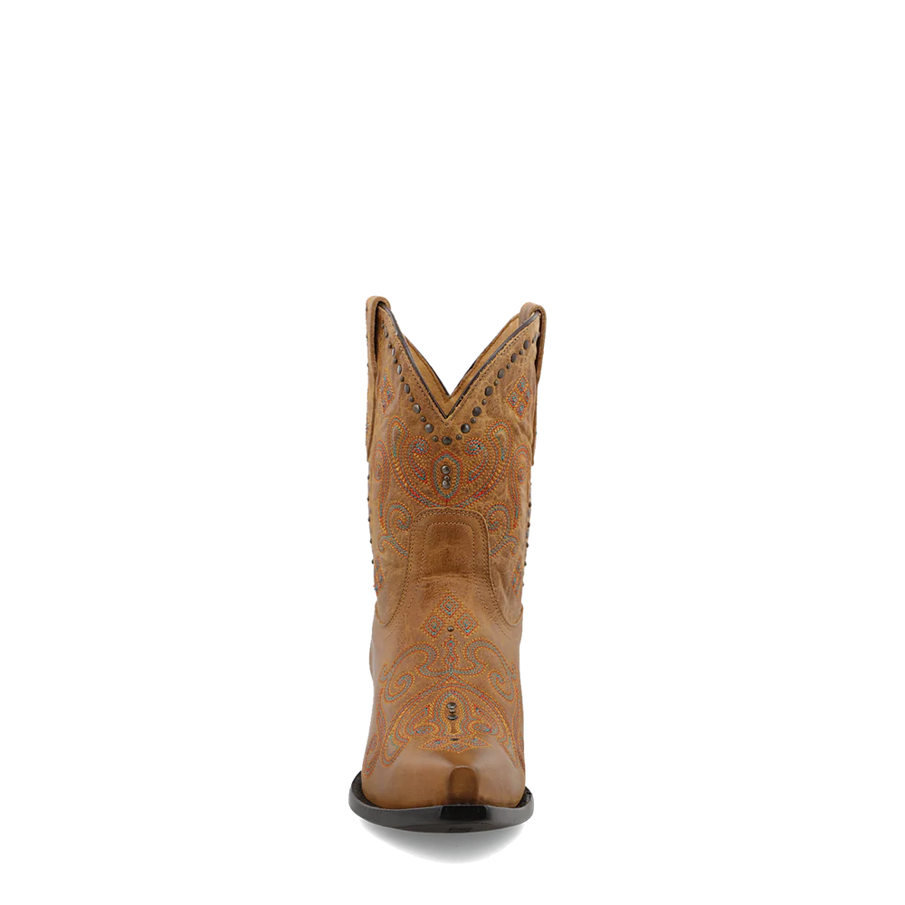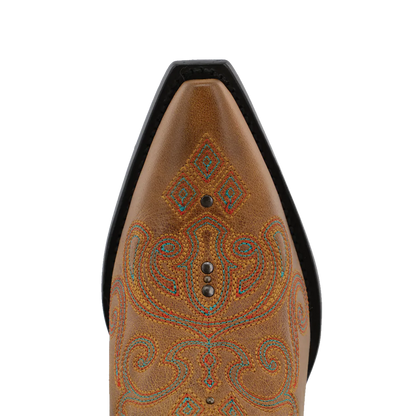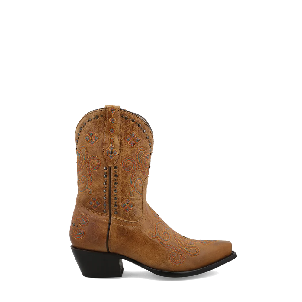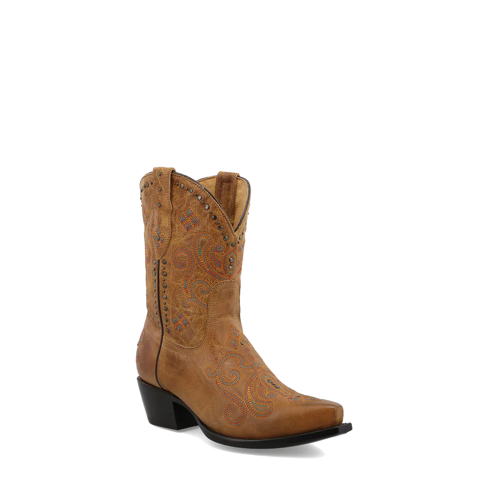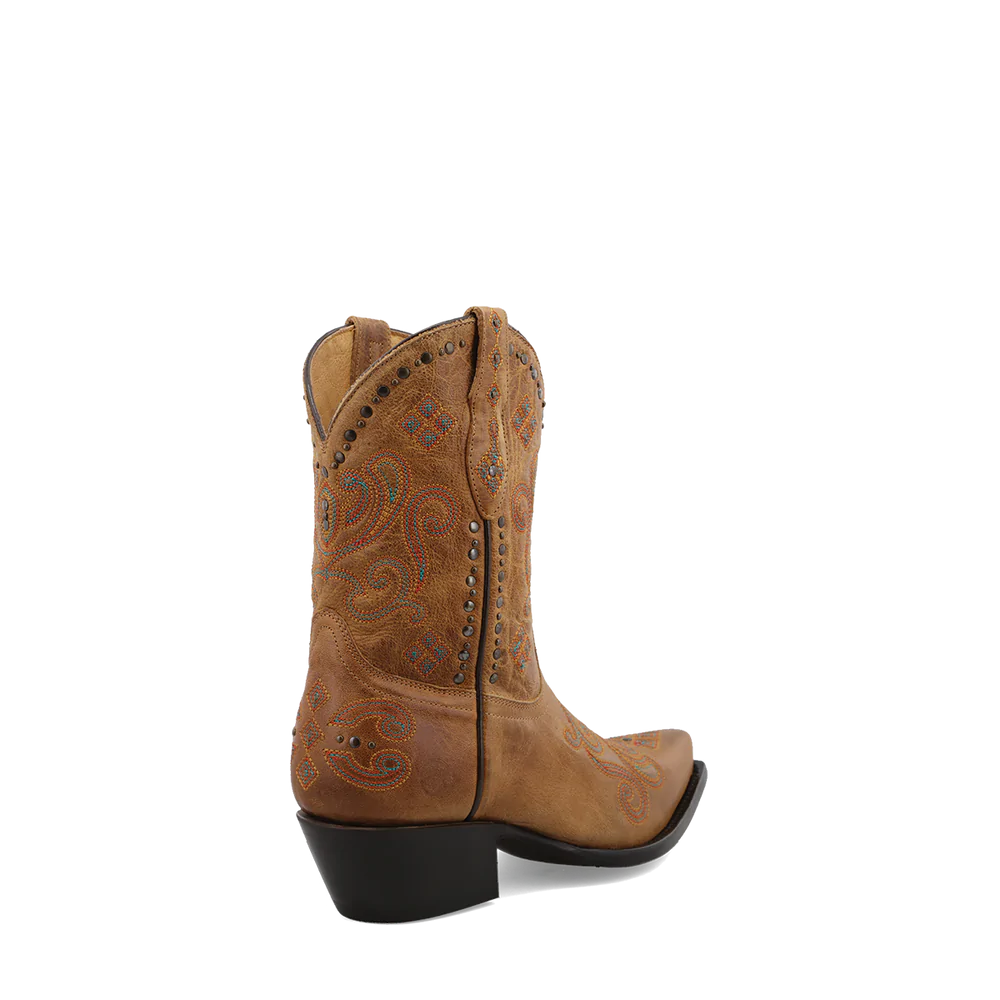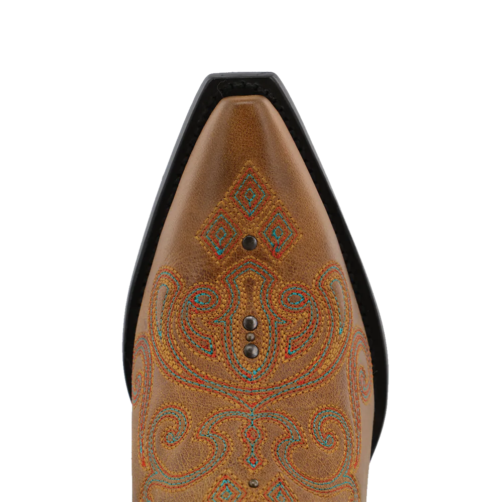 Versatility and style harmoniously align in the Aubrey bootie. The Aubrey bootie features elegant scrolled and geometrical embroidery alongside detailed studwork that adds subtle flair to this traditional western design. This bootie is wrapped in a beautiful Caramel leather that is easily dressed up or down depending on the occasion. You won't need to sacrifice comfort for style thanks to the soft leather lining and cushioned footbed that provide cloud-like comfort all day long. Featuring a 9" shaft height, western heel, and a sleek snip toe, the Aubrey is certain to become a favorite in any cowgirl's wardrobe.