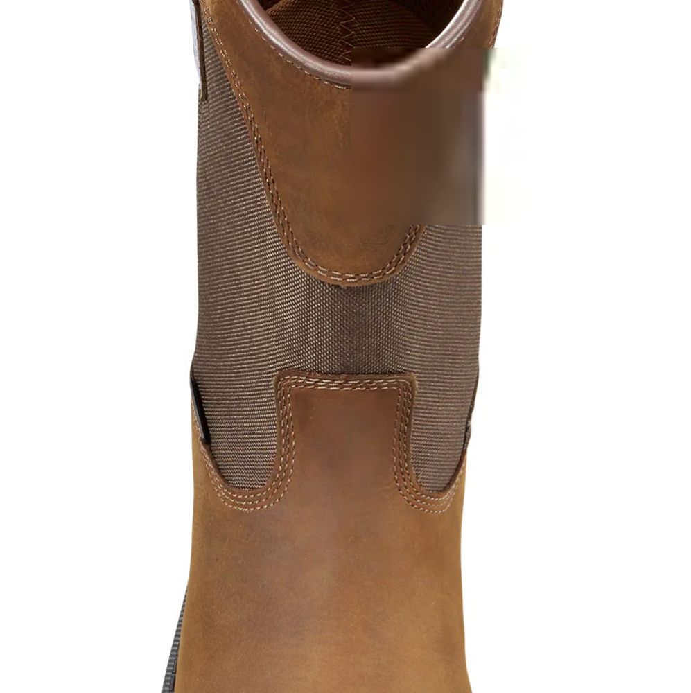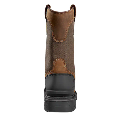 These men's waterproof boots are made for hard work in hard rain. They come equipped with a waterproof membrane that keeps out rain and mud but allows heat and sweat to escape. A Carhartt Ironwood outsole is slip resistant and meets ASTM F3445-21 SR standards to help protect against slips, trips, and falls. Alloy safety toe is made from blended metal and aluminum resulting in a thin lightweight safety toe for strength and comfort all day. It also meets ASTM 2413-18 standards.