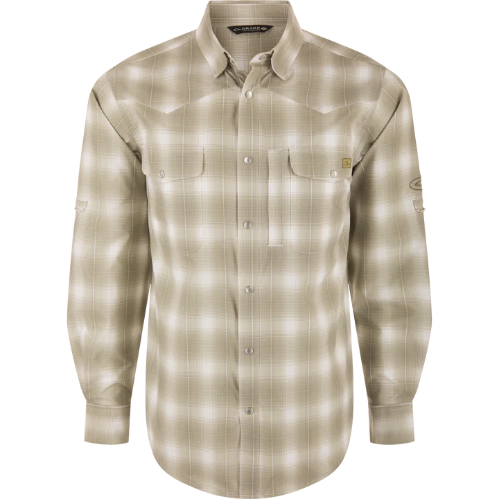 The Drake Cinco Ranch Western Plaid Shirt combines comfort and technology by using a unique micro-mesh weave made from 100% polyester. This performance fabric is lightweight at 120 GSM which allows moisture to wick quickly from the body. The micromesh supplies natural ventilation and has SILVADUR™ antimicrobial technology to keep the shirt fresh and odor free. It also has a UPF30 rating for sun protection plus it has natural stretch for ease of movement. The Drake Cinco Ranch shirt is packed with features: a western classic fit, Faux Pearl Snaps, a hidden button-down collar, a vented Western back cape, two snap button chest pockets with a Magnattach closure on the left pocket. It has a sculpted hem which allows you to wear tucked or untucked and has an adjustable tab if you want to roll up your sleeves. Inside the hem is a built-in sunglass wipe. The Cinco Ranch Western Shirt will perform whether you are on the range or on the boat.