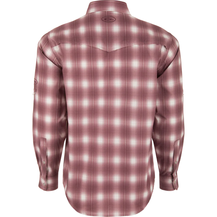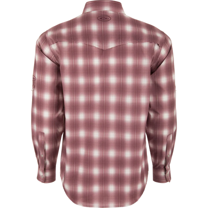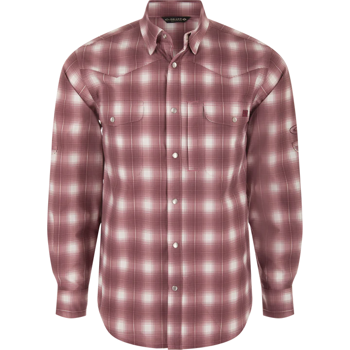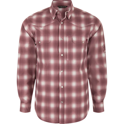 The Drake Cinco Ranch Western Plaid Shirt combines comfort and technology by using a unique micro-mesh weave made from 100% polyester. This performance fabric is lightweight at 120 GSM which allows moisture to wick quickly from the body. The micromesh supplies natural ventilation and has SILVADUR™ antimicrobial technology to keep the shirt fresh and odor free. It also has a UPF30 rating for sun protection plus it has natural stretch for ease of movement. The Drake Cinco Ranch shirt is packed with features: a western classic fit, Faux Pearl Snaps, a hidden button-down collar, a vented Western back cape, two snap button chest pockets with a Magnattach closure on the left pocket. It has a sculpted hem which allows you to wear tucked or untucked and has an adjustable tab if you want to roll up your sleeves. Inside the hem is a built-in sunglass wipe. The Cinco Ranch Western Shirt will perform whether you are on the range or on the boat.
