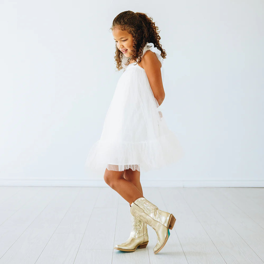 Classic, cute, and ready to shine — the Lil’ Lane Smokeshow Boot in Champagne Metallic brings big sparkle to little steps.