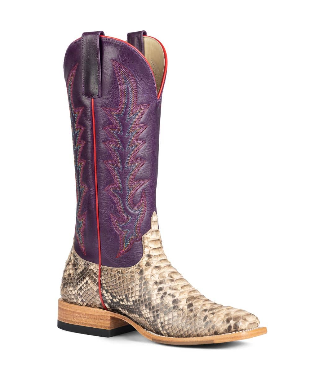 Top Hand Collection; 13″ Shaft; Mink Python (Black Cut) Vamp; Purple Texas Shaft With Contrast Stitching; Coral Piping; Leather Pull Tabs For Easy On; Cushion Insole; Tan Hybrid Outsole; Roper Leather Stacked Heel; DB Toe; Color: Natural/Purple; Style #M2042