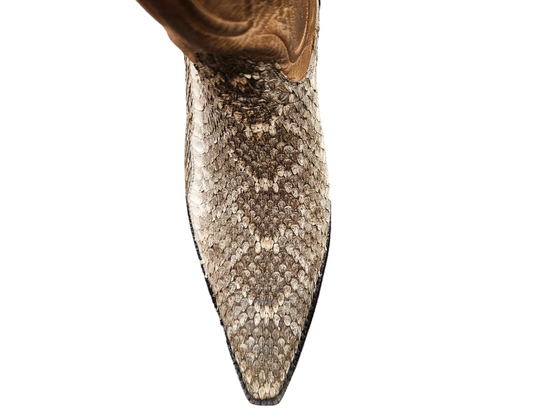 These 12” shaft boots are crafted with genuine rattlesnake leather, making them a striking addition to any cowboy’s wardrobe. The unique texture and intricate patterns of these exotic rattlesnake cowboy boots offer a one-of-a-kind look that will turn heads wherever you go.