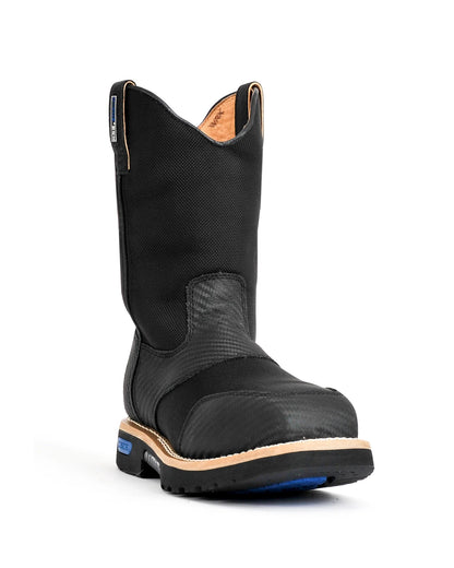 Mens Cinch Work Boots: Mens Western Work Boots. These are a Great waterproof Work Boot from Cinch! These WRX leather boots are featured in Black with a Rubber Sole Bottom Finish. Waterproof Bootie. They have a #1 Heel, a WRX Scallop, a Ceramic Composite Toe, and a 11" Shaft Height. They pull on and have a square toe. WXM107SW