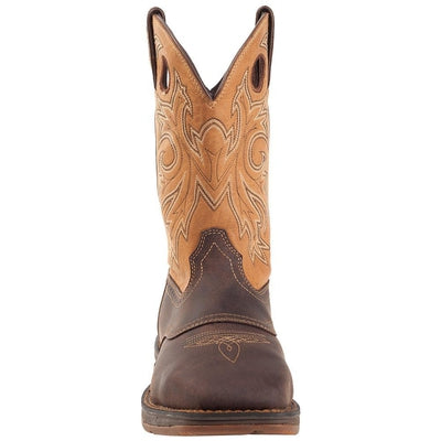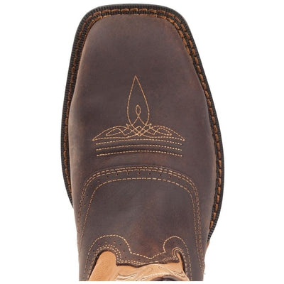 This men’s 11” square-toe Western boot is part of the Rebel by Durango collection, so you can be certain that it will be lightweight, comfortable to wear and outstandingly durable. Its upper has been constructed out of full-grain leather; the slight distressing, handsome stitching and combination of burnt yellow and brown hues creates a very nice looking men’s boot. Having finger holes, pull straps and a slightly dipped topline allow you to pull these Western boots on with absolute ease.
