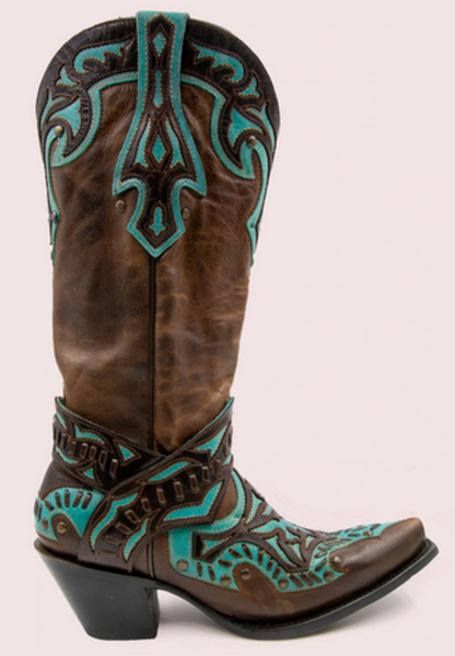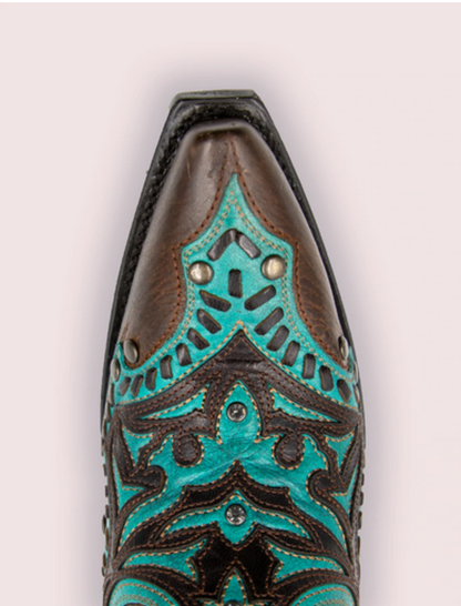 Glistened studs and jewels embedded within genuine leather to grace a beautiful glimpse of light, with every bit of movement. Elegant wrapped leather, with inlay and classic buck-stitch detailing, as a pop of fashion on an established cowboy boot.